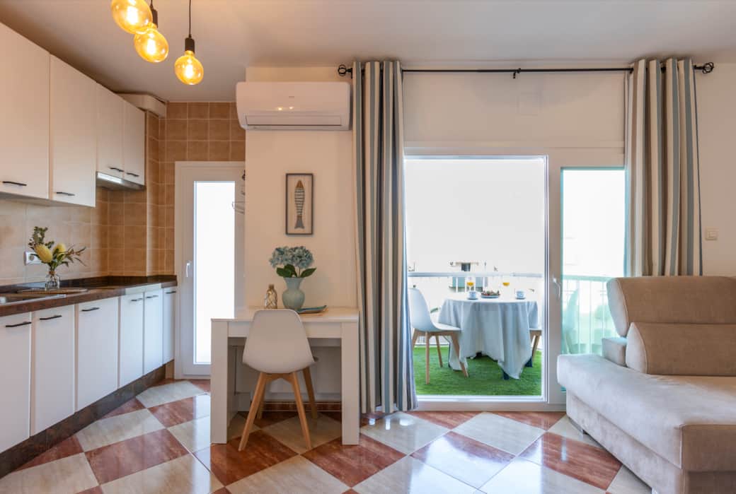 Este apartamento esta situado en planta 4 cuenta con terraza, TV de pantalla plana, salón con cocina americana totalmente equipada y 1 baño. El alojamiento es para no fumadores.